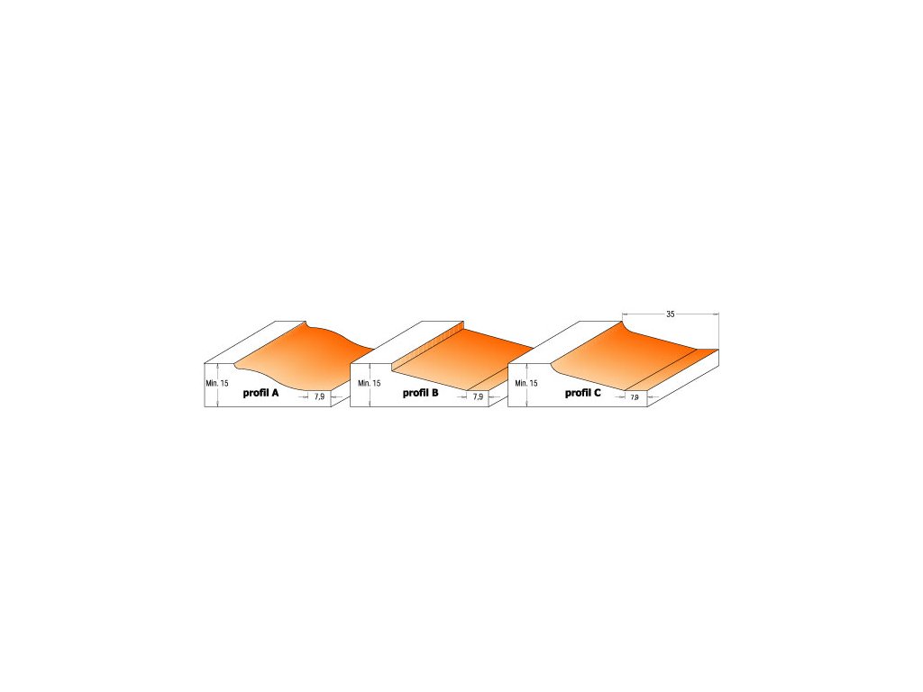 POZOR: Frézy používejte při nižších otáčkách mezi 10000 a 12000 ot./min. Pro bezpežné a přesné dosažení požadovaného profilu doporučujeme tři až pět průchodů. Výkon frézky musí být nejméně 1500W.