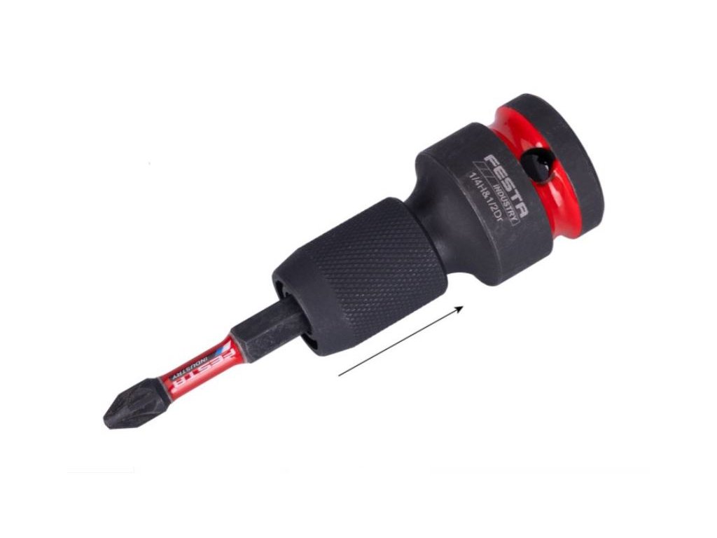 - rázový / úderový adapter z 1/2″ čtyřhranu na 1/4″ šestihran s pojistkou pro rázové utahováky (zajištění bity proti vypadnutí),