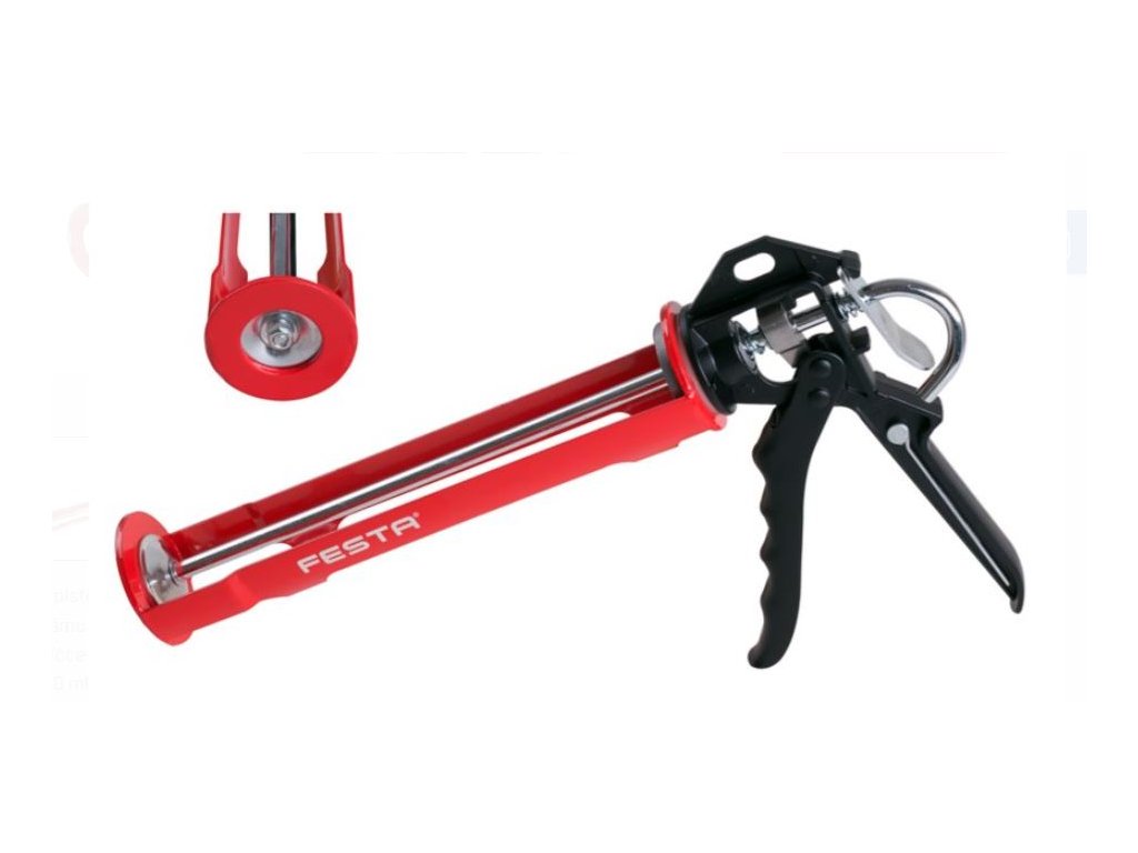 Vytlačovací pistole FESTA, PROFI, kvalitní zesílený a profilovaný ocelový rám i výtlačný a pojezdový mechanismus, uzavřené zakončení rámu pistole, kovová ergonomická rukojeť pro pohodlnou práci, profilované kovové bočnice, trn na čištění zaschlého tmelu ve špičce kartuše, použití : zesílený rám pro extra husté tmely - chemické kotvy a malty, pro vytláčení tmelů a lepidel v kartuších 310 ml.
