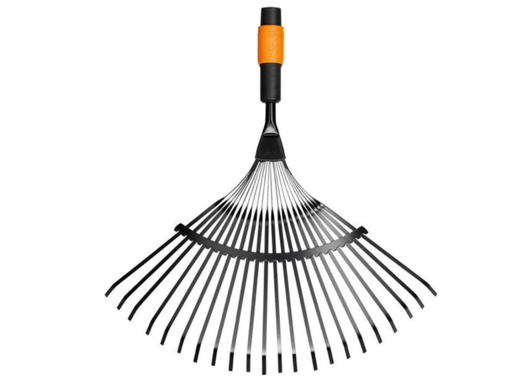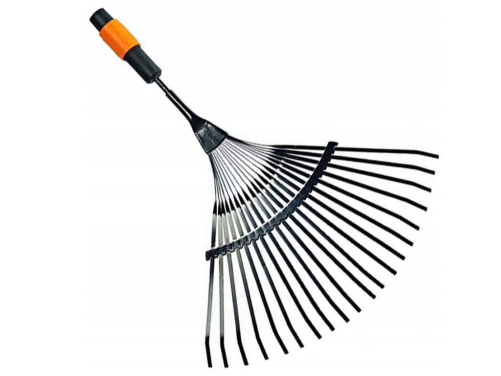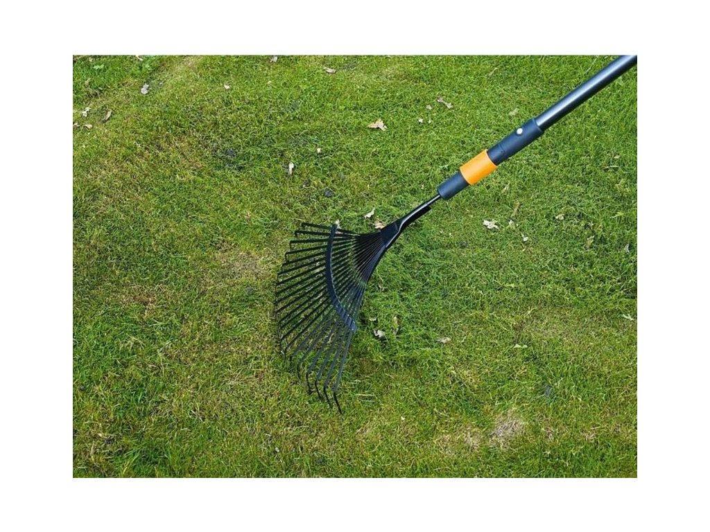 Díky pružným kovovým prstům dobře sbírá nečistoty a přitom nepoškozuje trávník.