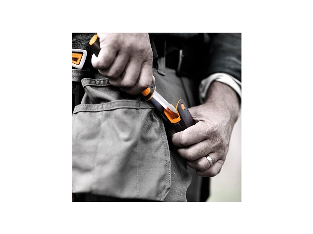 Univerzální nůž Fiskars s brouskem je univerzální nůž s čepelí z vysoce kvalitní oceli. Je součástí nové řady univerzálních nožů Fiskars s integrovaným brouskem, která byla vyvinuta ve spolupráci s nejnáročnějšími uživateli nožů. Inovativní, vestavěný brousek máte vždy u sebe, a může si tak být jisti, že nikdy nebudete muset řezat tupým nožem nebo přerušit práci.