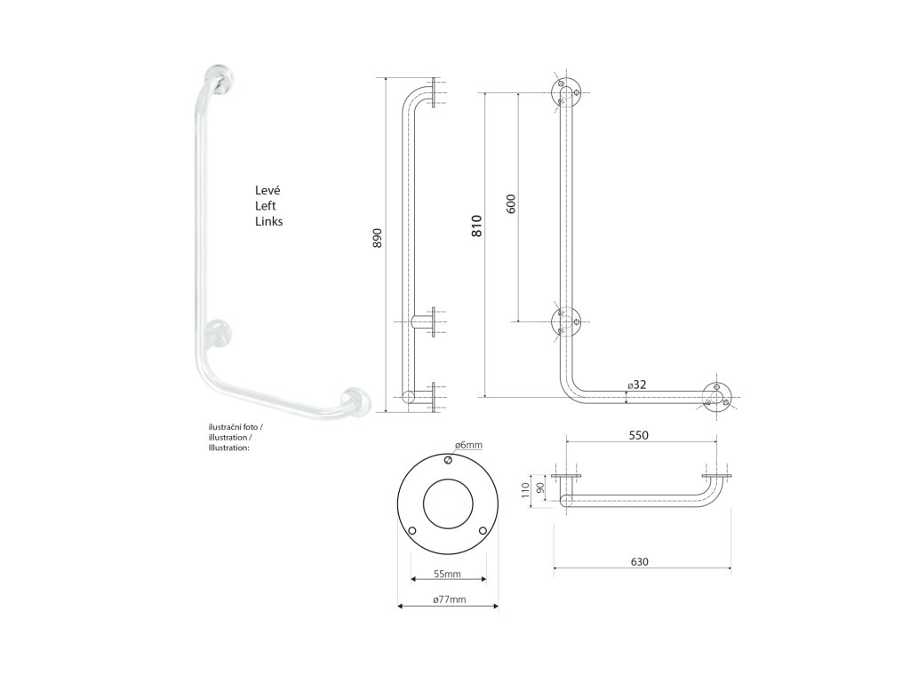 HANDICAP nástěnné madlo LEVÉ 810x550mm, bílá