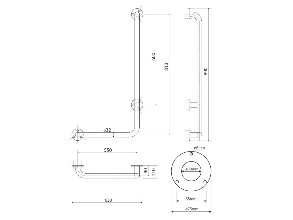 HANDICAP nástěnné madlo PRAVÉ 810x550mm, bílá
