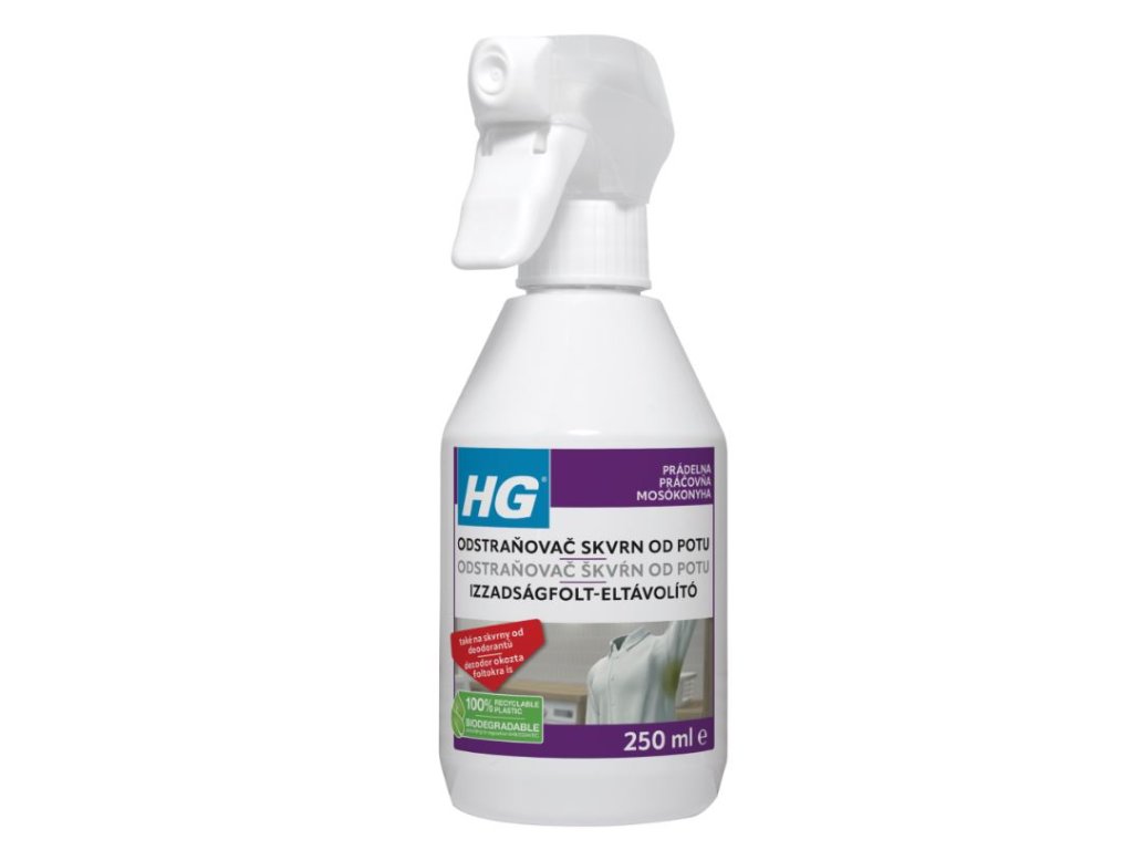 HG odstraňovač skvrn od potu je účinným přípravkem pro odstranění žlutých skvrn z textilu v důsledku potu nebo deodorantů. Tento typ žlutých skvrn nelze odstranit běžným pracím prostředkem nebo odstraňovačem skvrn, ale docílíte toho pomocí přípravku HG odstraňovač skvrn od potu.