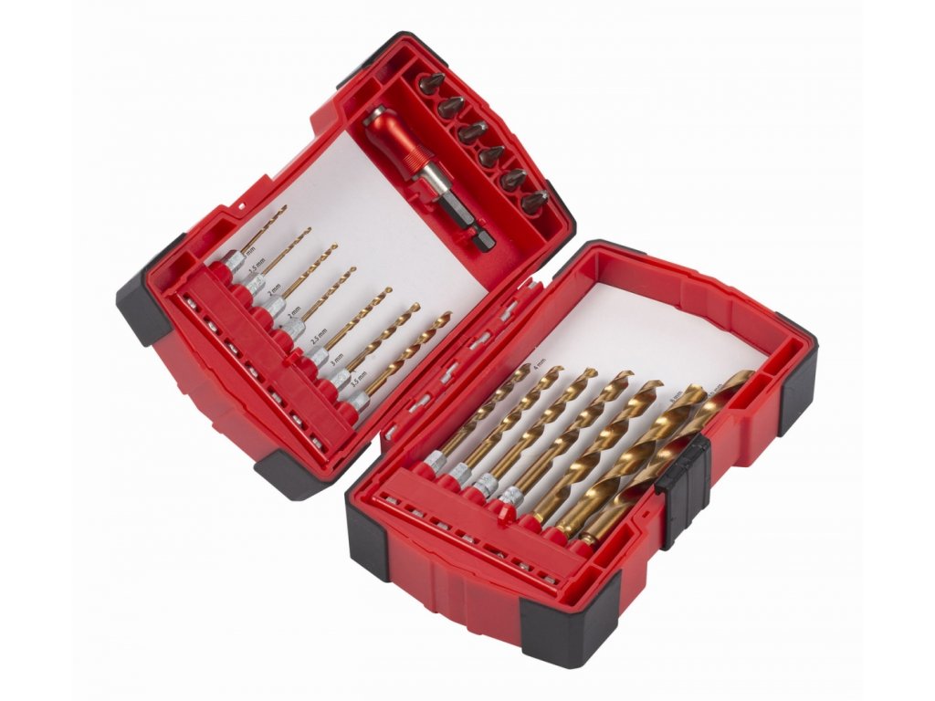 V této 21dílné sadě vrtáků a šroubovacích bitů najdete nepochybně to správné příslušenství pro všechny vaše vrtačky a šroubováky: PH bity, PZ bity, v různých velikostech, držák bitů s rychlou výměnou, vrtáky do dřeva a kovu. Sada je dodávána v praktickém pouzdru s pogumovanými rohy o rozměru 173x113x53 mm. Specifikace: 14 vrtáků do dřeva a kovu HSS se šestihrannou stopkou: 1,5x2ks, 2x2ks, 2,5, 3, 3,5, 4, 4,5, 5, 6, 7, 8, 10 mm 6ks S2 bitů 25 mm: (Philips(R)) PH1, PH2, PH3 (Pozi) PZ1, PZ2, PZ3 1 držák bitů s rychlou výměnouDoplňkové parametry