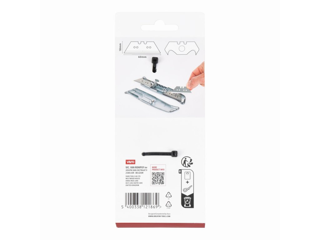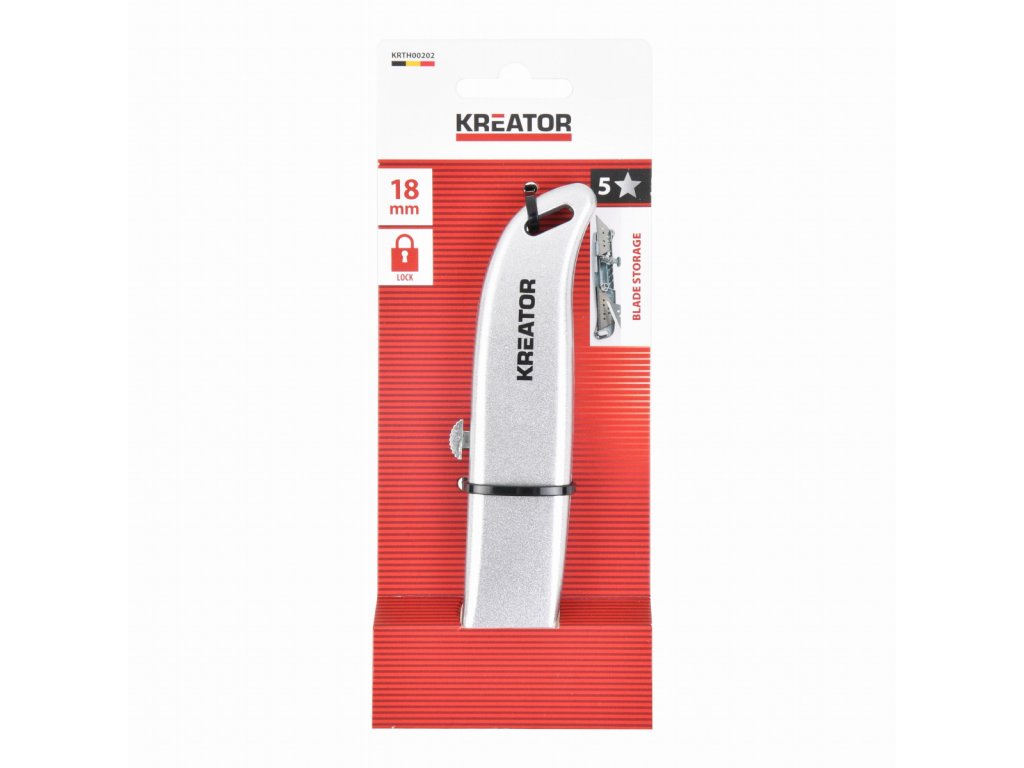 S tímto robustním nožem KRTH00202 od Kreator ze slitiny zinku snadno řežete koberce, vinyl, střešní krytinu, obaly a podobně. Můžete použít rovné i zahnuté čepele. Pro vaši bezpečnost se čepel dá po použití okamžitě zasunout zpět. Čepel můžete zaaretovat pomocí zajišťovacího mechanismu.