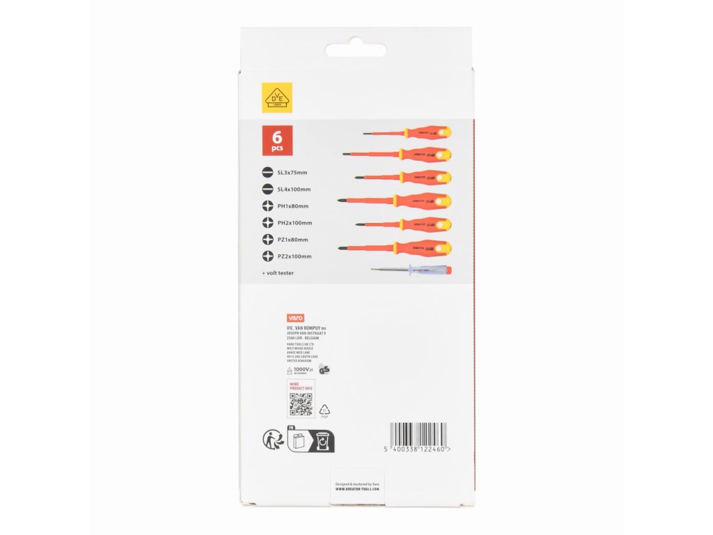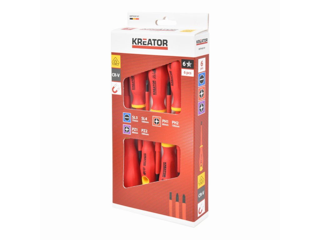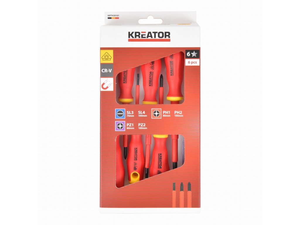 Tato sada elektrikářských šroubováků KRTH20101 od Kreator je kompletně izolovaná a certifikovaná VDE, což znamená, že jste chráněni před úrazem elektrickým proudem až do 1000 V a můžete bezpečně pracovat s elektřinou. Voltmetr v této sadě je vybaven kontrolkou, která okamžitě indikuje detekci napětí. Sada obsahuje tyto šroubováky: Plochý: 3.0 (75 mm), 4.0 (100 mm), Philips: PH1 (80 mm), PH2 (100 mm), Pozidriv: PZ1 (80 mm), PZ2 (100 mm).