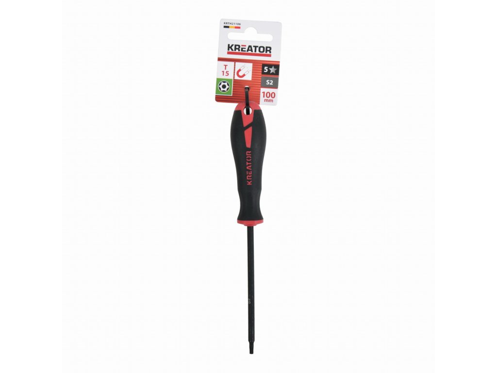 Tento TORX šroubovák KRTH21106 z naší řady Kreator má 100 mm dlouhou stopku a je vyroben z vysoce kvalitní oceli S2. Magnetický hrot T15 urychluje proces šroubování. Měkká protiskluzová rukojeť poskytuje pevný úchop a rukojeť má integrované závěsné oko pro snadné skladování.