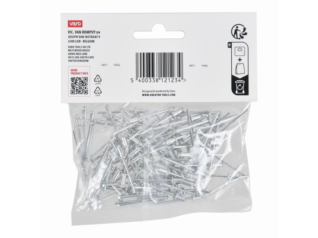 Tyto trhací nýty KRTH62702 z naší řady Kreator mají průměr 3,2 mm. Používejte je k rychlému a bezšroubovému spojení kovových, hliníkových nebo plastových předmětů o tloušťce až 3 mm. To se provádí pomocí nýtovacích kleští. Balení obsahuje 100ks.
