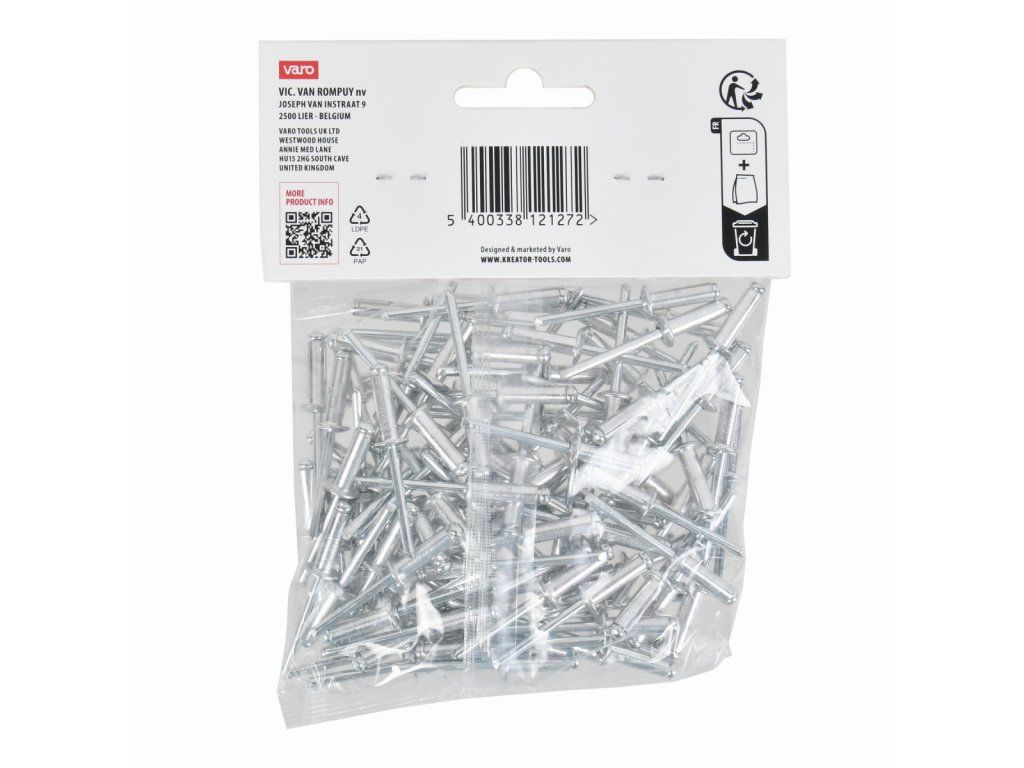 Tyto trhací nýty KRTH62706 z naší řady Kreator mají průměr 4,8 mm. Používejte je k rychlému a bezšroubovému spojení kovových, hliníkových nebo plastových předmětů o tloušťce až 12 mm. To se provádí pomocí nýtovacích kleští. Balení obsahuje 100ks.