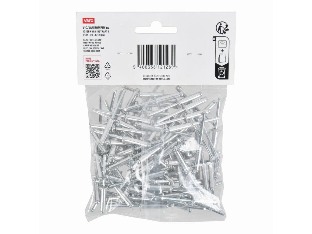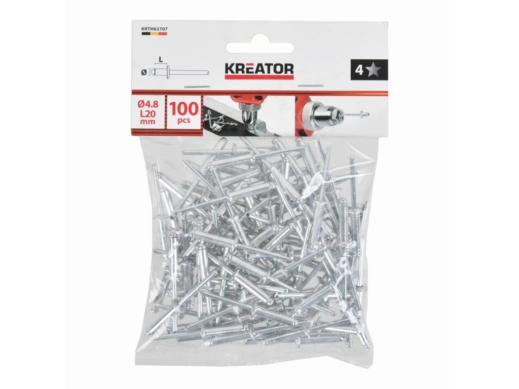 Tyto trhací nýty KRTH62707 z naší řady Kreator mají průměr 4,8 mm. Používejte je k rychlému a bezšroubovému spojení kovových, hliníkových nebo plastových předmětů o tloušťce až 16 mm. To se provádí pomocí nýtovacích kleští. Balení obsahuje 100ks.