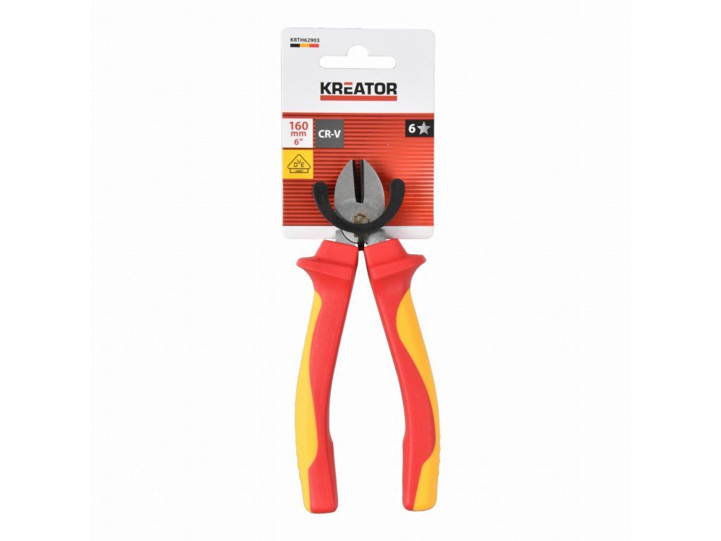 Tyto boční štípací kleště KRTH62903 z naší řady Kreator jsou izolované a certifikované VDE. Chrání vás před úrazem elektrickým proudem až do 1 000 V, takže můžete bezpečně stříhat jemné dráty a pevné kabely, a to i v případě, že jsou elektrické. Měkké gumové rukojeti poskytují protiskluzový a pohodlný úchop. Kleště mají délku 160 mm.