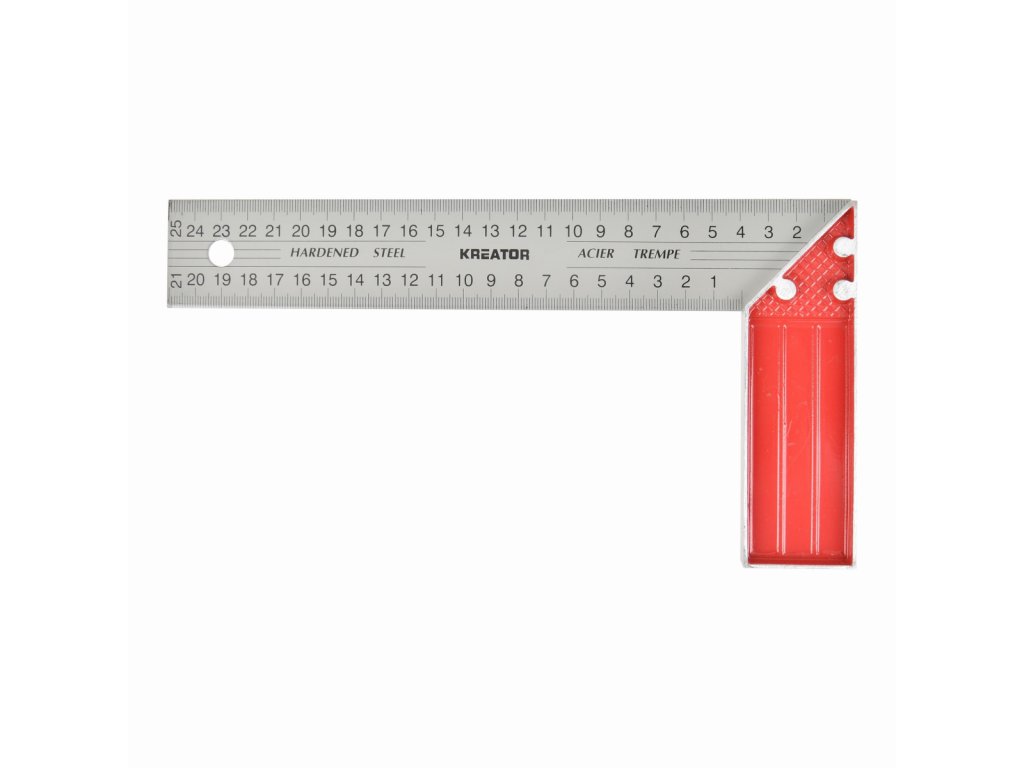 Tento úhelník KRTH70401 od Kreator má délku 250 mm a je vyroben z kalené oceli. Lze jej použít k měření a značení úhlů úhlů 90st a 45st. Navíc má integrované závěsné oko pro snadné skladování.
