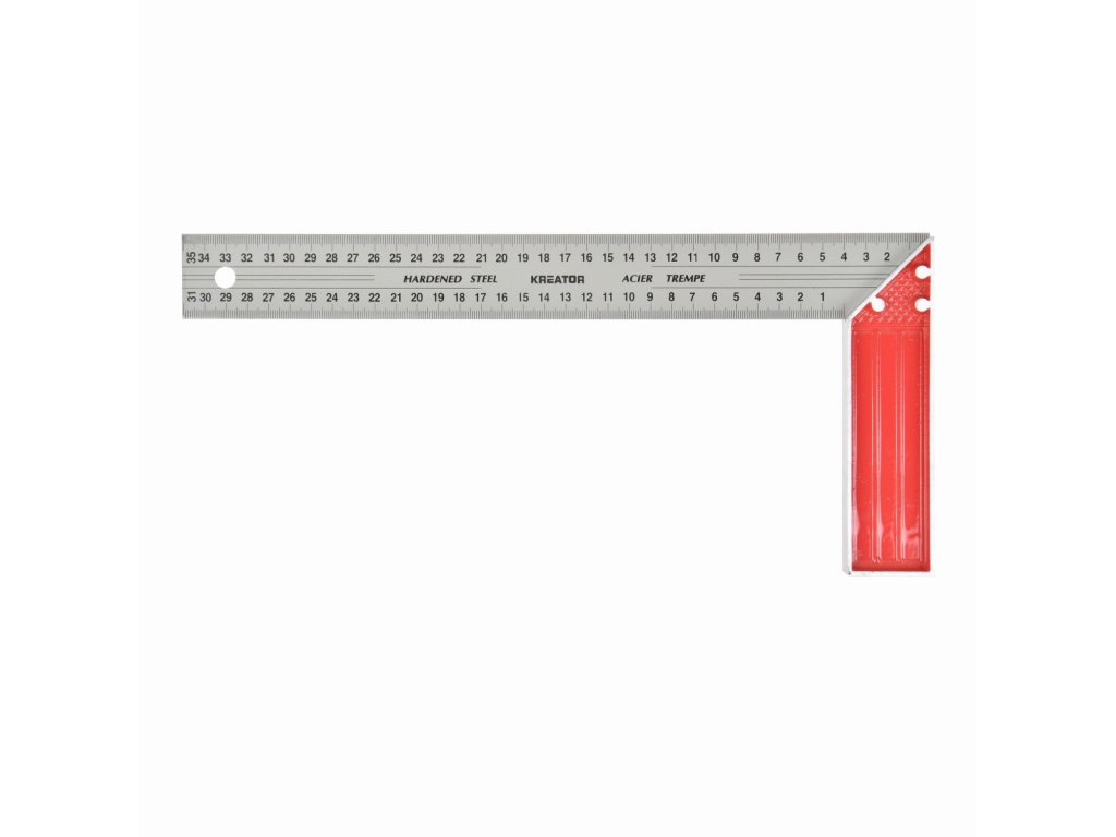 Tento úhelník KRTH70403 od Kreator má délku 350 mm a je vyroben z kalenéoceli. Lze jej použít k měření a značení úhlů úhlů 90st a 45st. Navíc má integrované závěsné oko pro snadné skladování.
