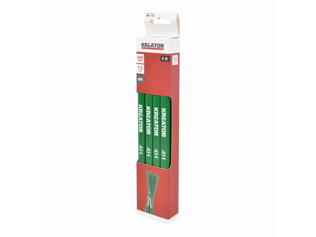Tyto tužky KRTH73302 z naší řady Kreator jsou určeny pro kameníky a zedníky. Kamenická tužka umožňuje kameníkovi vyznačit na povrchu kamene přesné čáry, řezy, body nebo ornamenty, které pak slouží jako vodítko pro ruční či strojní dělení a opracování materiálu. Tyto tužky se vyznačují velmi tvrdou tuhou. Tato vysoká tvrdost je nezbytná, aby tuha zanechala jasnou, tenkou a trvanlivou stopu na drsném a pevném povrchu kamene, aniž by se rychle opotřebovala nebo zlomila. Její plochý oválný tvar brání kutálení a umožňuje kreslit silné i tenké čáry a snadno se brousí nebo ostrouhá nožem. Tato sada obsahuje 12 červených tužek o délce 245 mm.