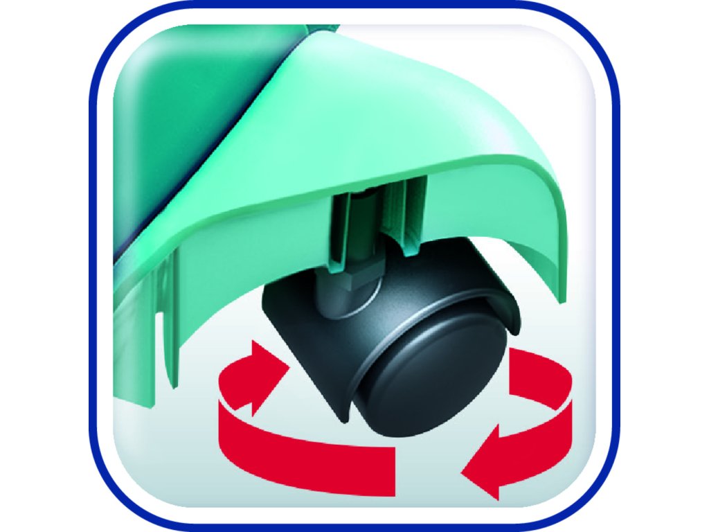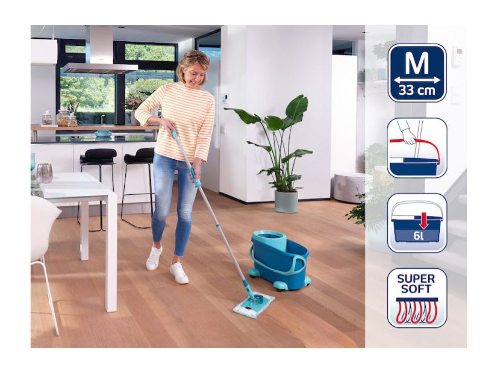 Nově inovovaný systém s vědrem na kolečkách, mopem a ždímacím nástavcem využívá patentovanou rotační technologii přímo v rukojeti, díky které se mop snadno vyždímá odstředivou silou. Výsledkem je optimálně vlhký mop, který nezatěžuje podlahu nadměrnou vodou, a přitom účinně odstraní všechny nečistoty.