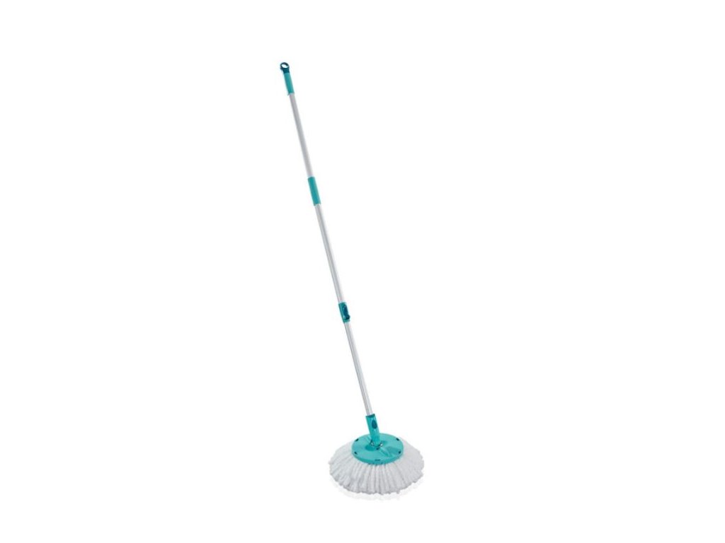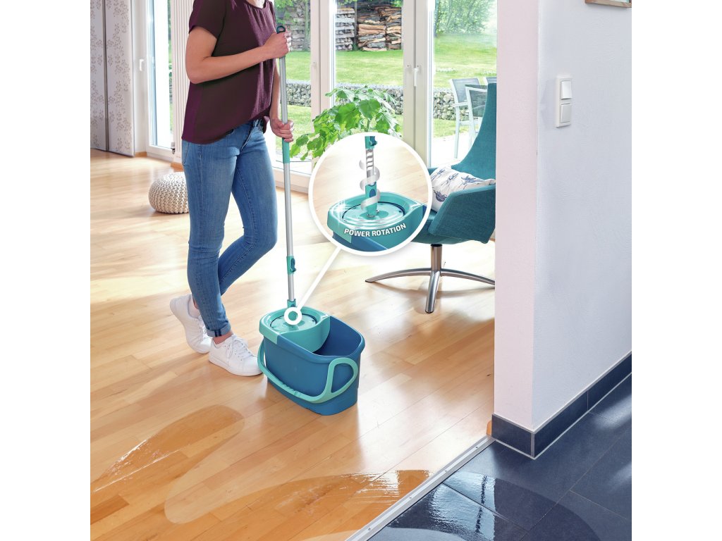 Bavlněné třásně zajistí důkladný úklid zejména dlažby a kamenných podlah, zatímco praktické vědro s rotační komorou umožňuje snadné ždímání a rychlé vylévání vody. Mop lze navíc fixovat přímo do držadla vědra, což usnadňuje kompaktní uskladnění.