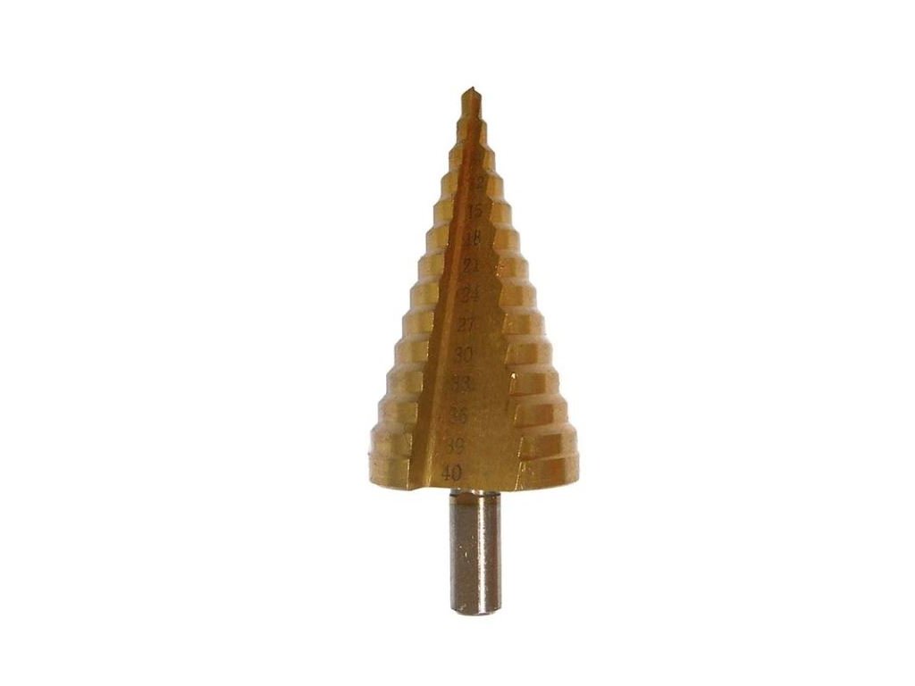 Stupňovitý vrták MAGG 070013 Průměr: 4 – 40 mm. Materiál: rychlořezná ocel HSS 4241 (High Speed Steel). Povrchová úprava: titan. Baleno v ochranném blistru.