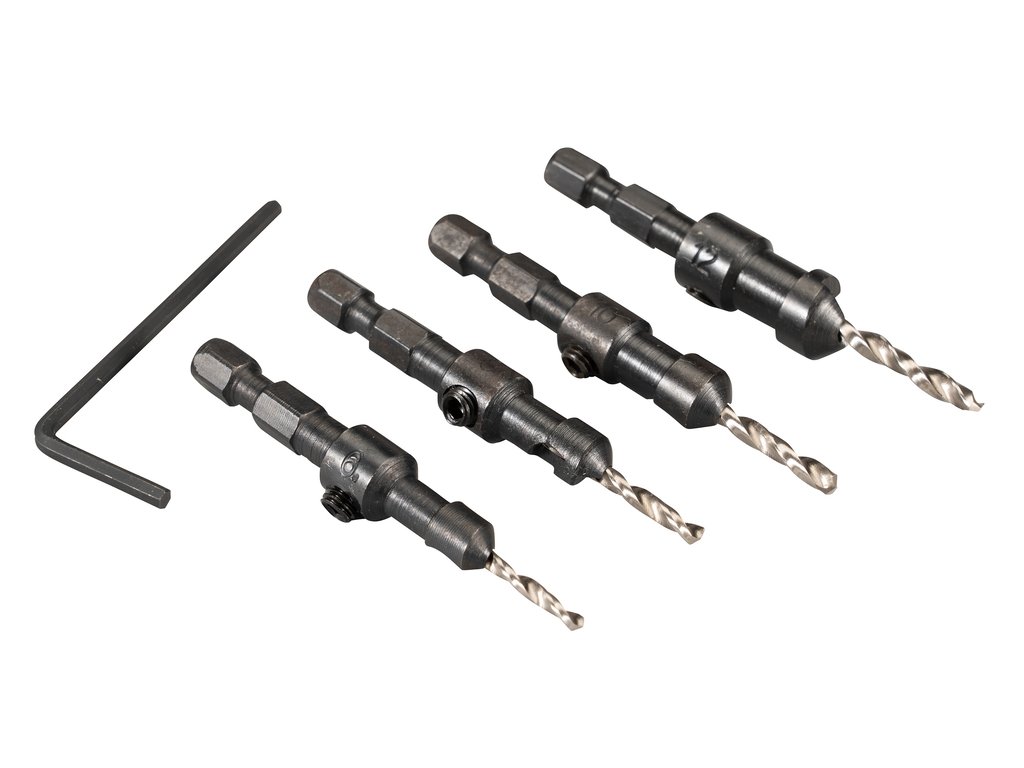 Obsah sady: 4 velikosti vrtáků – 2,4 mm / 6 mm, 2,8 mm / 8 mm, 3,2 mm / 10 mm, 3,6 mm / 12 mm (vrták / záhlubník).