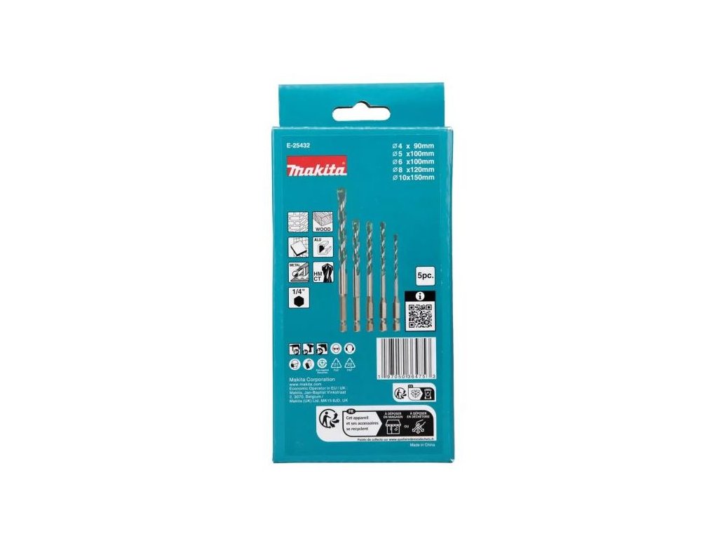 Makita E-25432 je kvalitní 5-dílná sada vrtáků TCT s 1/4″ šestihrannou stopkou, navržená pro multimateriálové použití. Díky vysoce odolnému karbidovému hrotu s příklepovým broušením a zesílené hlavě poskytuje spolehlivý výkon a dlouhou životnost i při častém vrtání.