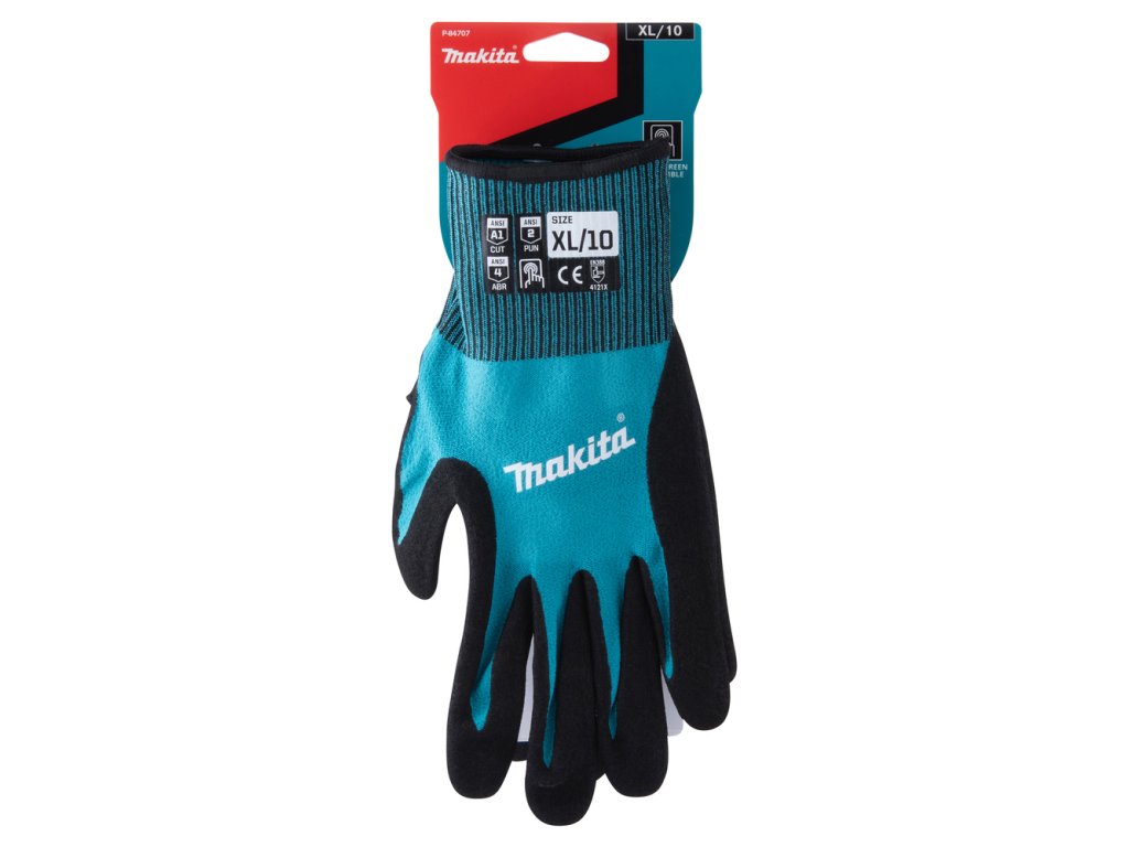 Makita rukavice pracovní pletené basic, nitril, XL – pracovní rukavice Makita P-84707 jsou pletené rukavice s nitrilovým potahem určené pro běžné údržbářské a manipulační práce. Mají prodyšný bezešvý materiál FitKnit™ pro komfort a flexibilitu, nitrilem potaženou dlaň pro lepší úchop, odolnost proti oděru, olejům a kapalinám, a kompatibilitu s dotykovými obrazovkami. Hodnoceny podle normy EN388: 4121X s úrovní odolnosti proti oděru 4 a proti proříznutí 1. Jsou vhodné pro dílnu, sklad, výrobu i domácí kutění a lze je prát v pračce.
