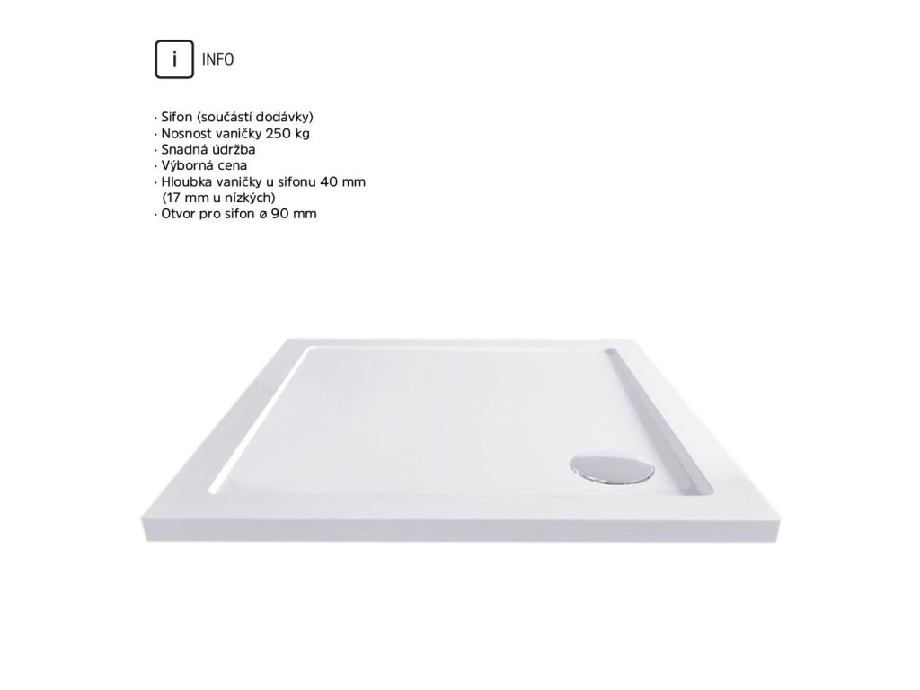 Čtvercová vanička Mereo je navržena s nízkou výškou 4 cm, což zvyšuje komfort vstupu do sprchového koutu. Díky své stabilní konstrukci poskytuje vysokou nosnost a bezpečné používání, a to i při každodenním zatížení. Součástí vaničky je otvor pro sifon ⌀ 90 mm, který umožňuje rychlou a snadnou instalaci odpadu.