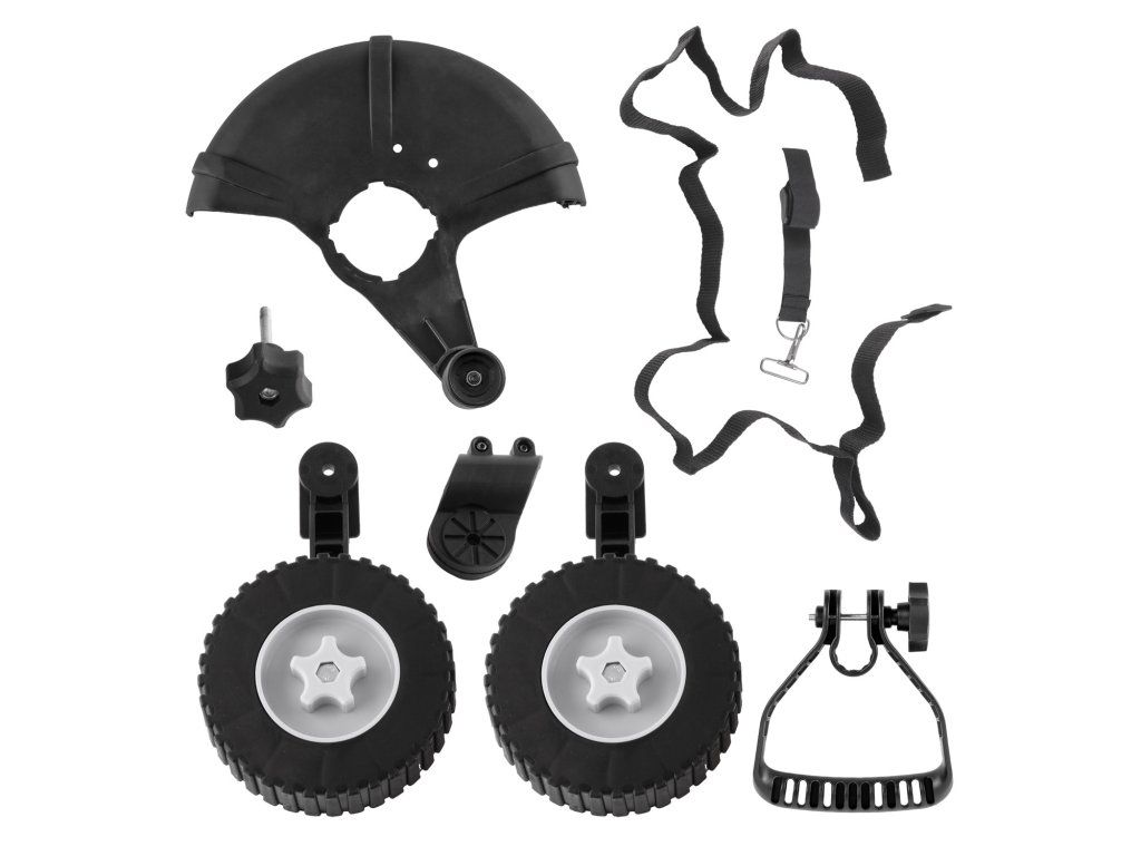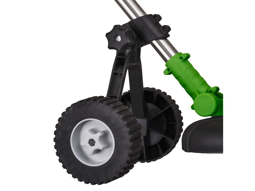 Mobilní konstrukce na kolečkách: Umožňuje plynulý pohyb po trávníku bez nutnosti držet celou hmotnost stroje, ideální pro delší práci.