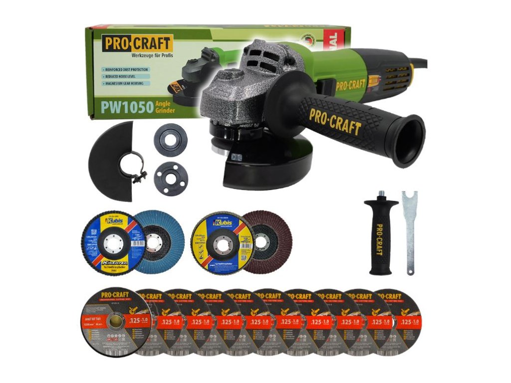Procraft PW1050 Bruska úhlová + 10x řezný kotouč, 2x lamelový kotouč