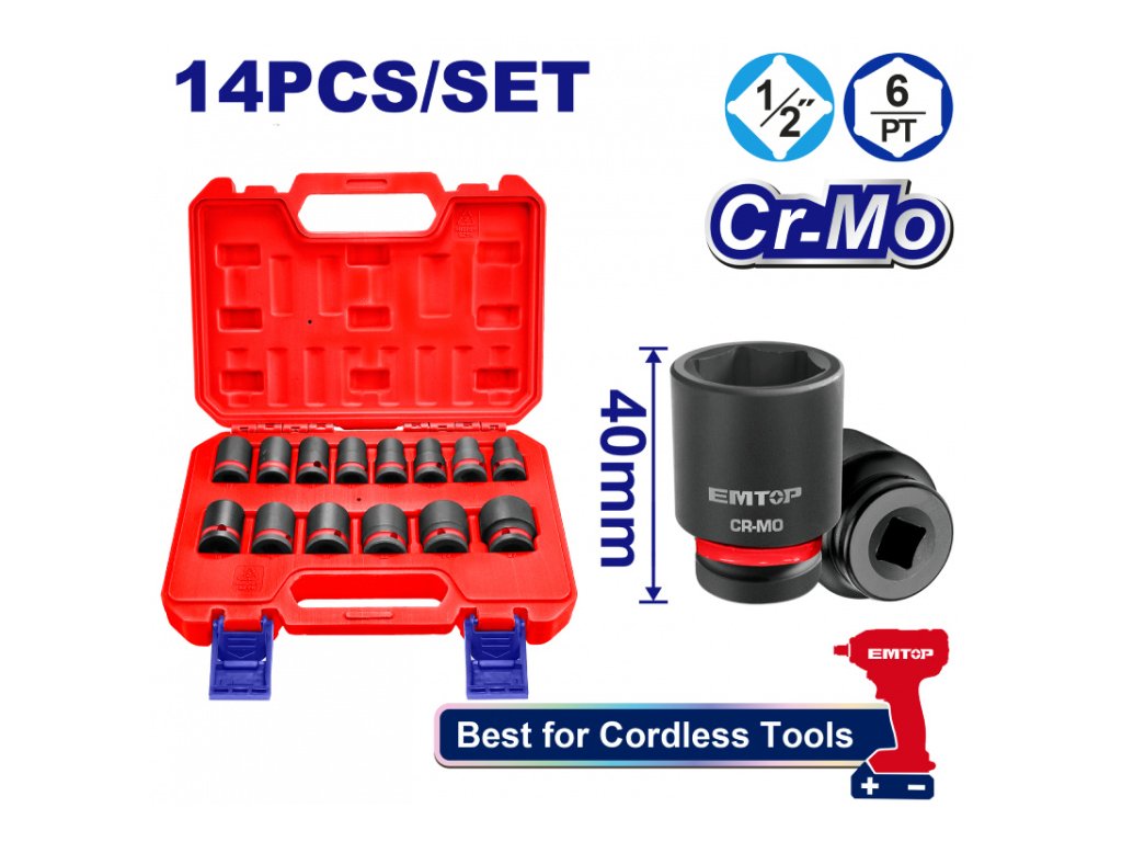 Sada 14 ks rázových nástrčných hlavic 1/2" L-40 mm