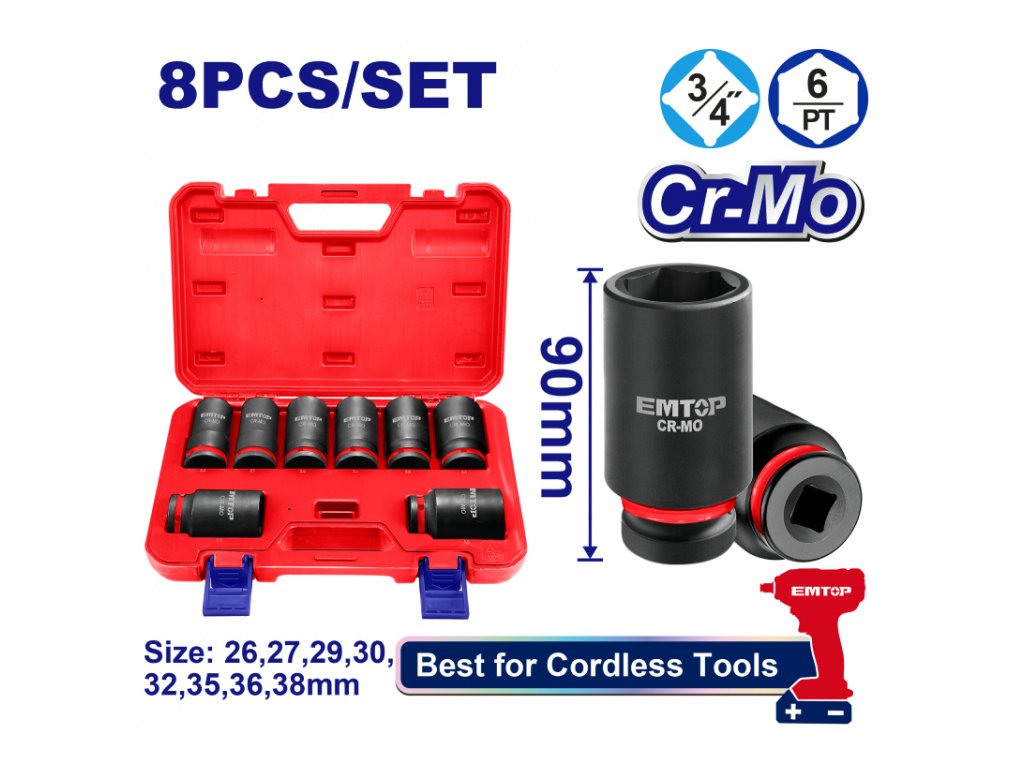 Sada 8 ks prodloužených rázových nástrčných hlavic 3/4" L-90 mm
