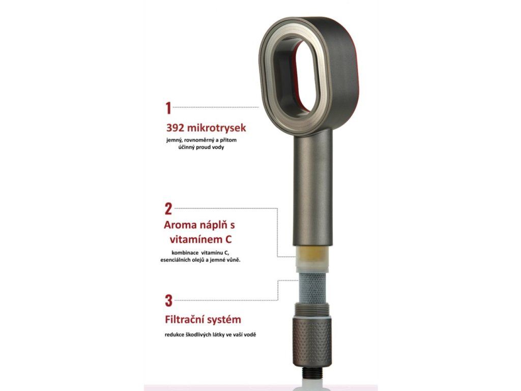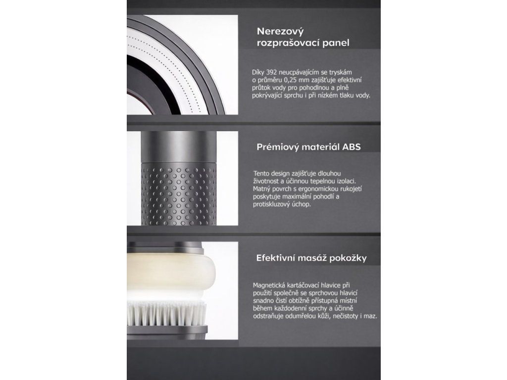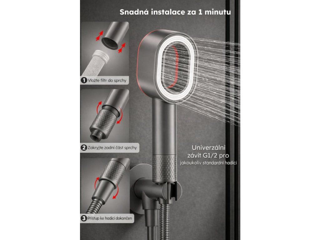 Luxusní sprchová hlavice s nerezovým panelemProměňte každodenní sprchu v domácí wellness.Rozlučte se s agresivními chemikáliemi, suchou pokožkou a poškozenými vlasy. Zažijte dokonalou sprchovou kúru, která každý den revitalizuje vaši pokožku, vlasy i smysly.Prémiový proud vody, který si zamilujeteLuxusní sprchová hlavice s nerezovým panelem a hustou sítí 392 mikrotrysek (0,25 mm) vytváří jemný, rovnoměrný a přitom účinný proud vody – pro pocit plného pokrytí i při nižším tlaku.Péče o pokožku: magnetický kartáč plus peelingová houbaMagnetický kartáč pomáhá snadno vyčistit hůře dostupná místa a zároveň pokožku jemně promasíruje. Peelingová houba šetrně odstraňuje odumřelé kožní buňky a nečistoty, zanechává pokožku hladší a svěžejší – ideální jako rychlý domácí peeling během sprchování.Hlavní benefityNerezový panel plus 392 mikrotrysek (0,25 mm)Plné pokrytí a příjemný proud i při nízkém tlaku vodyOdolné, lehké tělo z prémiového ABSLuxusní matný vzhled a protiskluzová ergonomická rukojeťSnadná instalace – bez instalatérských pracíCo je doopravdy ve vaší sprchové vodě?Vaše voda může vypadat čistě, ale může skrývat neviditelná rizika, která nenápadně, ale významně poškozují vaši pokožku a vlasy:Chlor ve vodě – vysušuje pokožku a způsobuje podrážděníTvrdá voda – usazeniny snižují hydrataci a zhoršují kvalitu vlasůTěžké kovy (olovo, měď, rtuť) – dráždí citlivou pokožku a mohou se hromadit v tělePesticidy – narušují hormonální rovnováhu a způsobují citlivost pokožkyRez a usazeniny – pronikají z potrubí a znečišťují voduMikroorganismy – zvyšují riziko infekcí a kožních zánětůMikroplasty – brání přirozené regeneraci pokožkyGLOX filtrační systém – čistá voda pro zdravou pokožkuACF filtr je navržen tak, aby účinně redukoval škodlivé látky ve vaší vodě. Díky pokročilým filtračním schopnostem chrání pokožku před vysoušením a podrážděním.Aroma náplň s vitamínem C – intenzivní péče při každé sprše ACF (Activated Carbon Fiber – aktivní uhlíkové vlákno) je moderní filtrační materiál vyráběný karbonizací speciálních vláken. Oproti klasickému granulovanému aktivnímu uhlí má výrazně odlišnou strukturu – tvoří jej hustá síť mikropórů s extrémně velkým aktivním povrchem. Díky tomu dosahuje výrazně vyšší absorpční schopnosti a rychlejší filtrace vody.Ve sprchových filtrech ACF účinně zachytává a odstraňuje zbytkový chlór, který může vysušovat pokožku i vlasy. Současně pomáhá eliminovat mechanické nečistoty, jako jsou nánosy, rez a další mikročástice vznikající například v potrubí. Filtrační vlákna rovněž redukují nepříjemný zápach vody a přispívají ke zlepšení její kvality při každodenním sprchování.Výhodou ACF je rychlá reakční doba, vysoká účinnost i při krátkém kontaktu s vodou a rovnoměrná filtrace po celé ploše materiálu. Díky těmto vlastnostem patří mezi nejúčinnější technologie používané v moderních sprchových filtrech a pomáhá zvyšovat komfort sprchování i šetrnost vody k pokožce a vlasům.Doplňkové parametry
