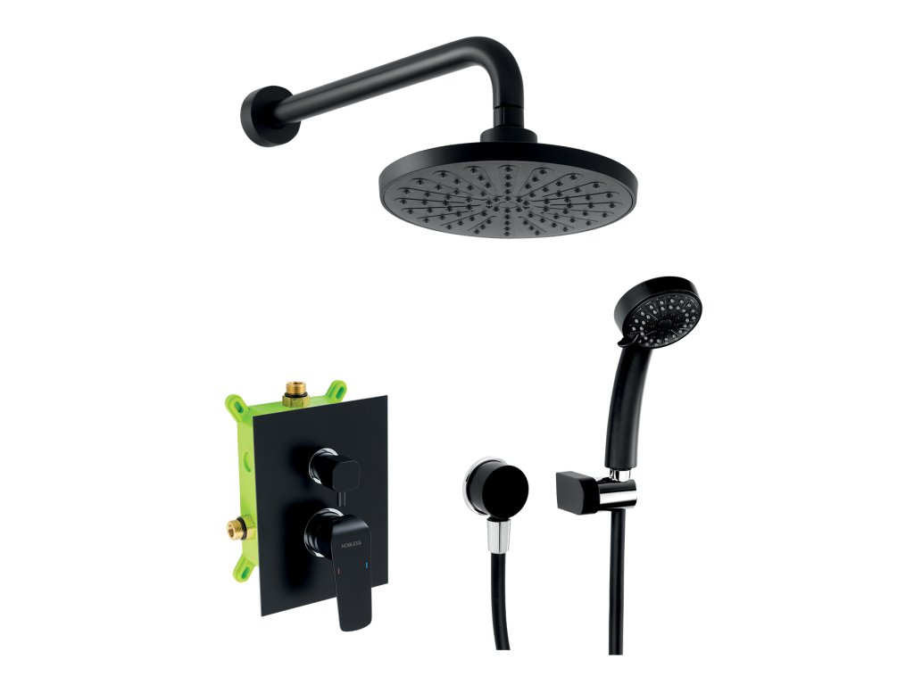 Sprchová podomítková sada s příslušenstvím v provedení černá-mat. Box je dodávaný komplet včetně krytu a ovládací páky. Sada obsahuje podomítkovou sprchovou baterii s kvalitní keramickou kartuší s prodlouženou zárukou 5 let a keramickým přepínačem, plastovou hadici 150 cm, ramínko ze zdi v délce 350 mm, hlavovou sprchu o průměru 200 mm, 3-polohovou ruční sprchu, stěnový vývod vody a držák na ruční sprchu.Doplňkové parametry