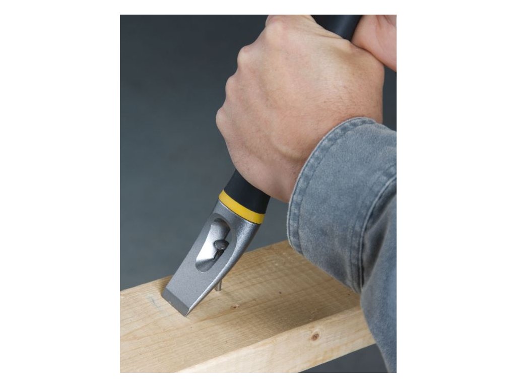 Nástroj je vybaven dvojitými odstupňovanými čelistmi pro pohodlné uchopení dřeva různých tlouštěk a zkosenou drážkou na hřebíky pro snadné zvedání a vytahování spojovacích prvků. Texturovaný povrch rukojeti zaručuje pevný úchop a maximální kontrolu i při práci v mokrém prostředí. Tvrzená ocel navíc chrání před vznikem třísek a zvyšuje odolnost při náročném použití.