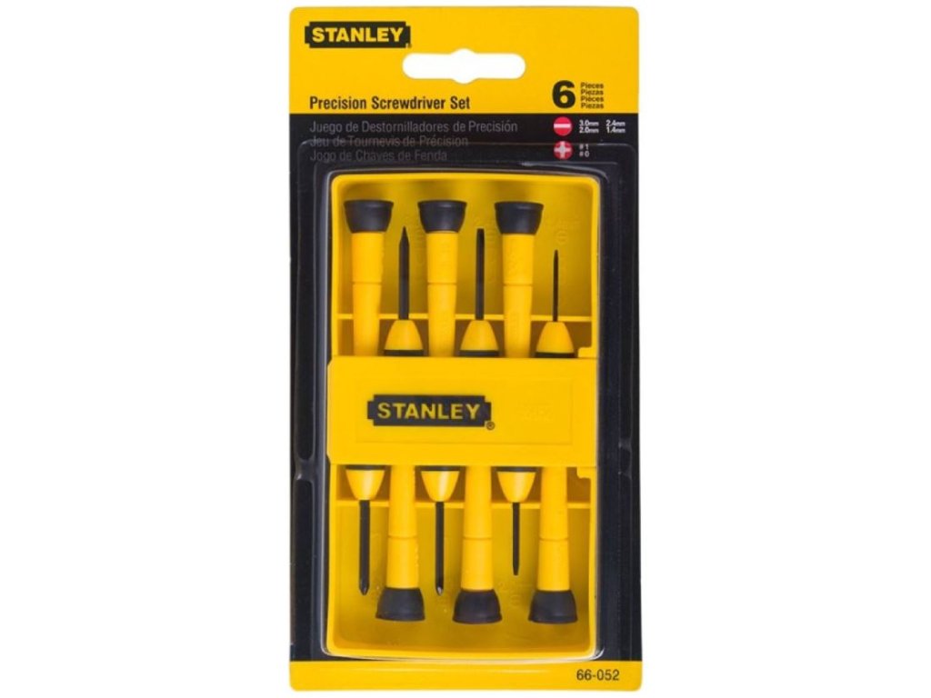 Sada Stanley 0‑66‑052 obsahuje šest nejpoužívanějších přesných šroubováků — čtyři ploché (1,4 mm, 2,0 mm, 2,4 mm, 3,0 mm) a dva křížové (Phillips PH0, PH1) — což ji činí univerzální volbou pro jemné šroubování, montáž elektroniky, drobné opravy či servisní práce.