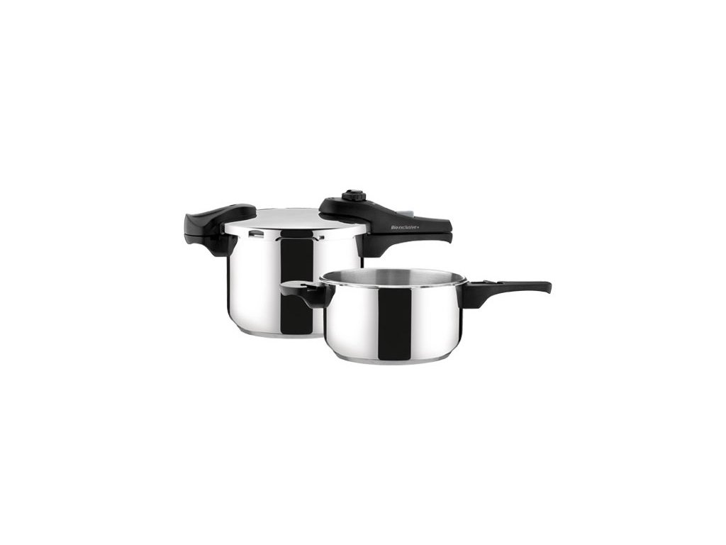 Souprava tlakových hrnců BIO EXCLUSIVE+ Duo obsahuje dvě nádoby 4.0 + 6.0 l a univerzální poklici. Tlakový hrnec je vyroben z prvotřídní nerezavějící oceli, umožňuje vaření pří nízkém nebo vysokém tlaku, je ideální pro rychlou a současně šetrnou přípravu pokrmů. Tlakový hrnec je vybaven 4 pojistkami pro bezpečné použití a opatřen masivními rukojeťmi. Třívrstvé sendvičové dno je vhodné pro všechny typy sporáků – plynové, elektrické, sklokeramické a indukční. Součástí tohoto výrobku není napařovací síto ani poklice. 5 roků záruka.