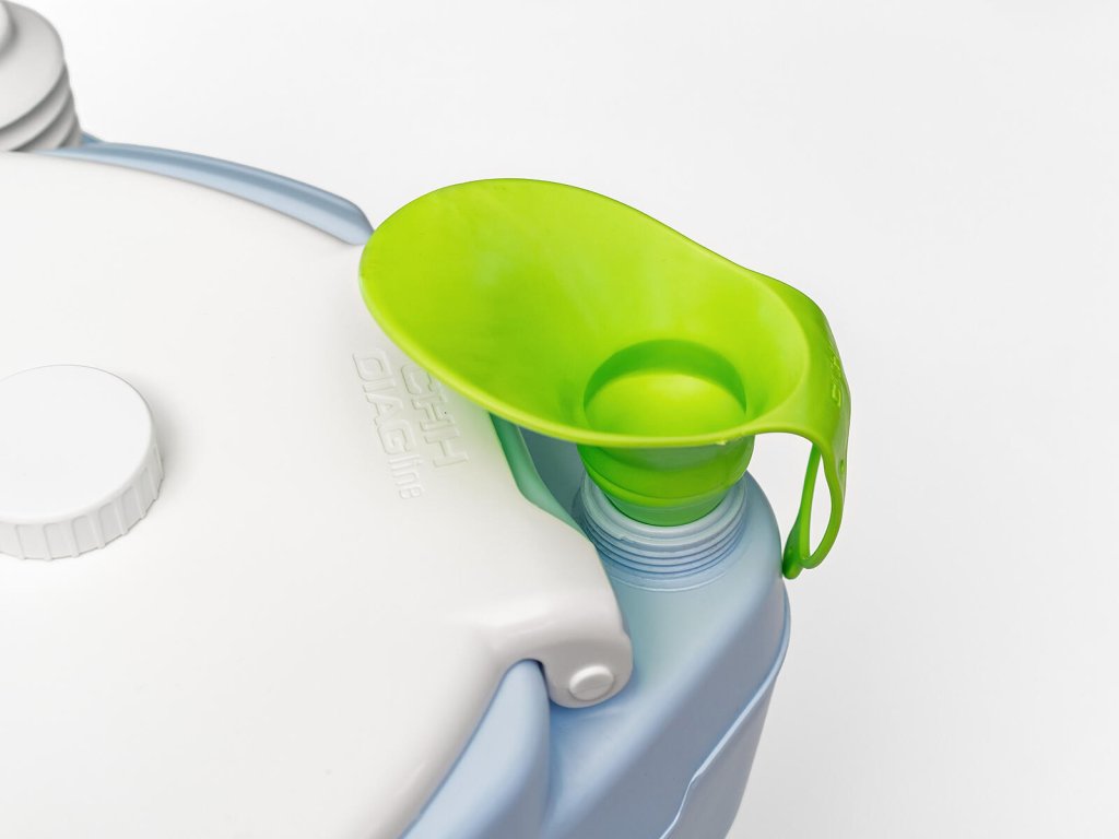 Výrobek je nově vybaven nalévacím trychtýřem pro lepší manipulaci při doplnění chemických WC náplní.