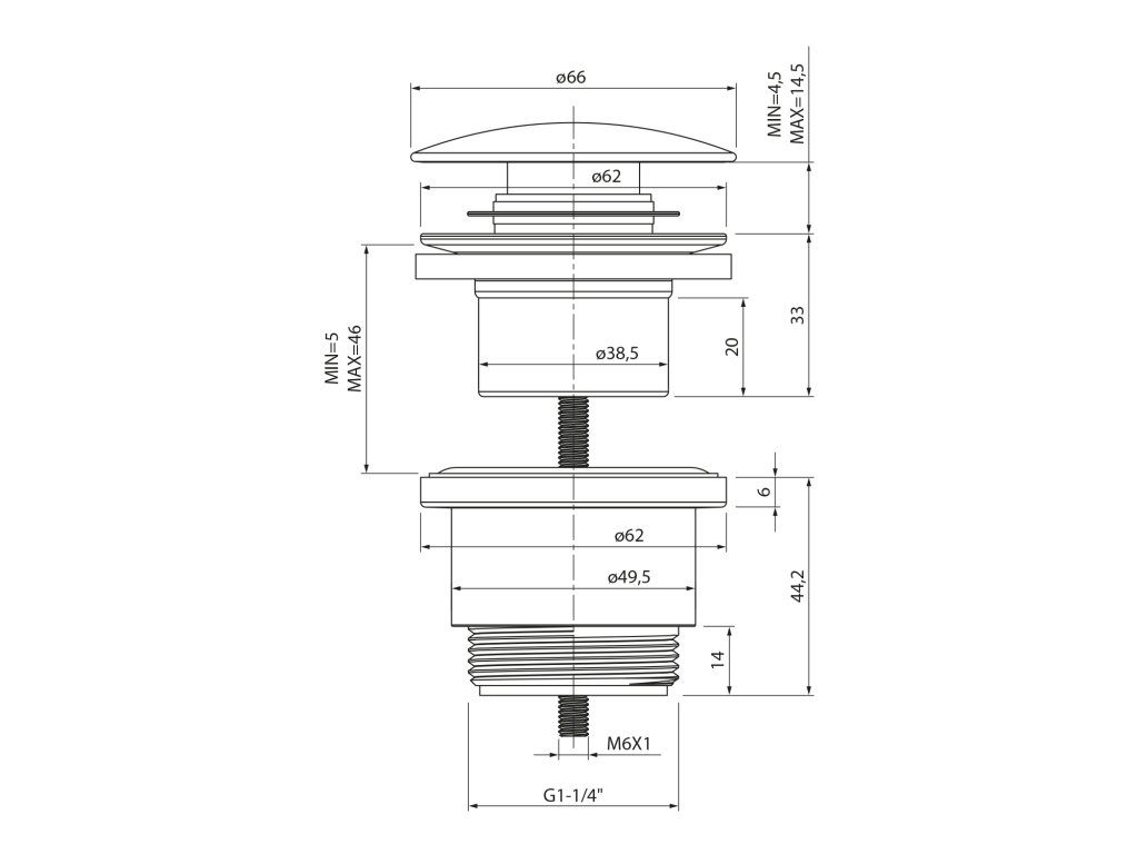 Umyvadlová výpust 5/4“, click-clack, velká zátka, 5-46mm, ABS/chrom