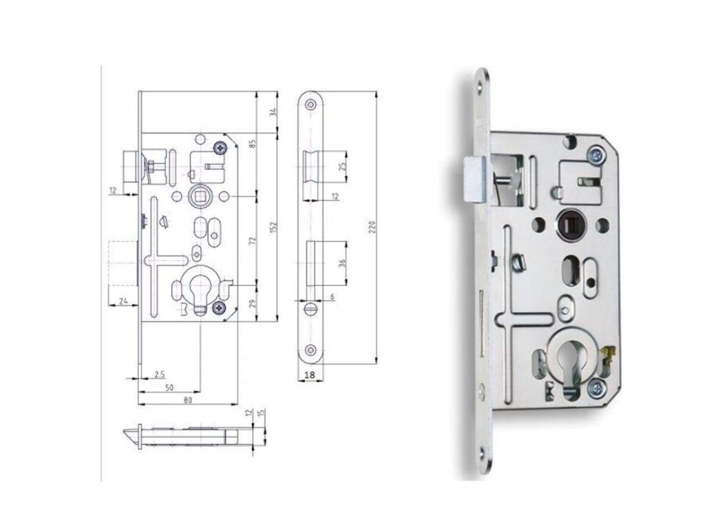 Tento model je dvouzápadový (má dva výsuvné západy) a je vybaven převodem, což znamená, že ovládání klíčem může posunout i střelku. Konstrukce je navržena jako pravolevý (P-L), tedy univerzální – zámek lze použít jak na pravé, tak levé dveře.