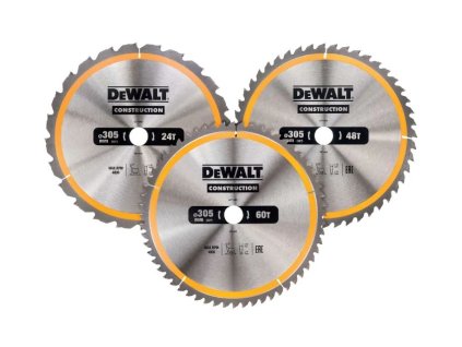 Sada DEWALT DT1964 obsahuje tři konstrukční kotouče 305 × 30 mm s počty zubů 24T, 48T a 60T. Ideální pro stacionární pily při řezání měkkého dřeva a kompozitních materiálů....